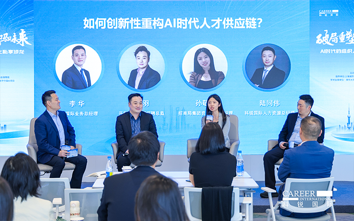 圆桌讨论环节,由JDPAY钱包官网国际业务总经理李华主持,开利亚太总部招聘总监邹羽、招商局集团资深AI产品经理孙敬萍、JDPAY钱包官网国际人力资源总经理陆同伟三位专家,分别从外资、央国企和民企视角,围绕AI时代人才供应链创新性重构话题展开深度对话。