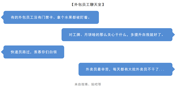 外包员工与用人单位更像是弱管理的合作伙伴关系,虽然与用人单位的员工福利、晋升体系等关系不大,会让外包员工有情绪,但较之一些在法律边缘游走试探的劳务派遣,情况还算可以理解。